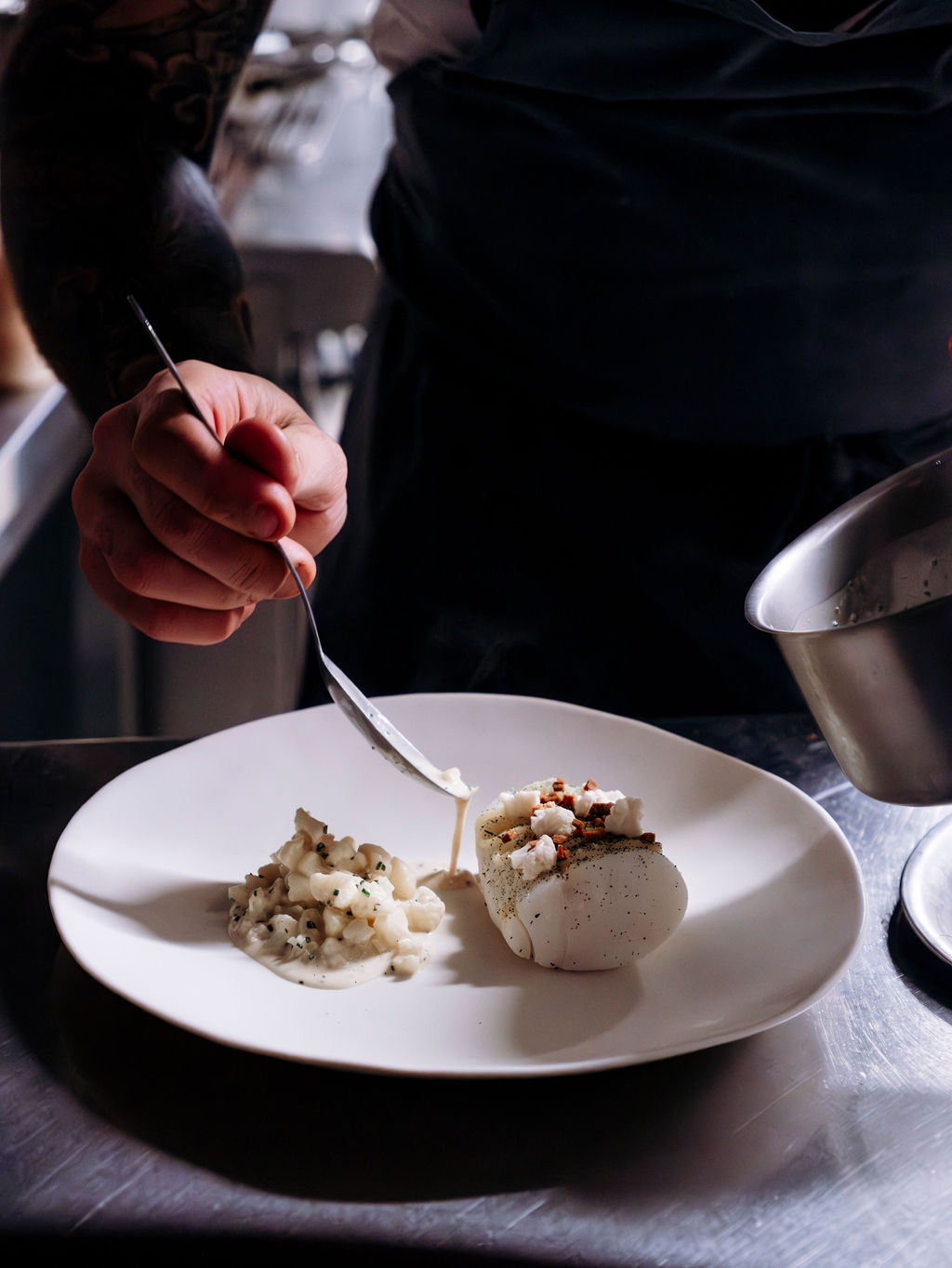 Pêche du jour | Céleri rave bergamote | Bimi | Sauce tourin à l’ail confit et capucine